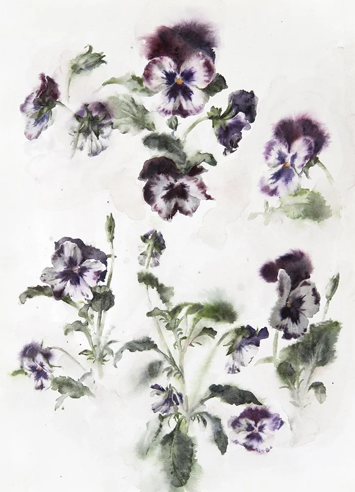 With velvety leaves and effusive petals, pansies emerge spontaneously from the field of white paper, turning this way and that: “What happens to the beautiful little faces when they are looking sideways and in the shadow, or when they have leaves surrounding them and their small faces are peeking out? Looking at pansies can become a whole world... The word pansy comes from the French word pensée: if you give someone a pansy, it means you are thinking of them,” Artin says.
