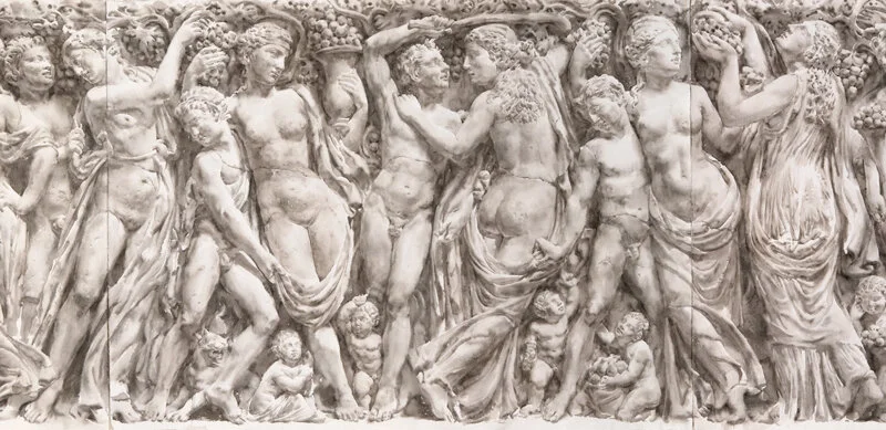 The centerpiece of the show is a tour-de-force watercolor drawn from the 2nd Century Farnese Sarcophagus, one of the most important works of art in the Isabella Stewart Gardner Museum. The scenes depicted on the huge marble are those of revelry, and Artin shows satyrs cavorting with the women as they gather grapes, pulling at their tunics and exchanging amorous glances.