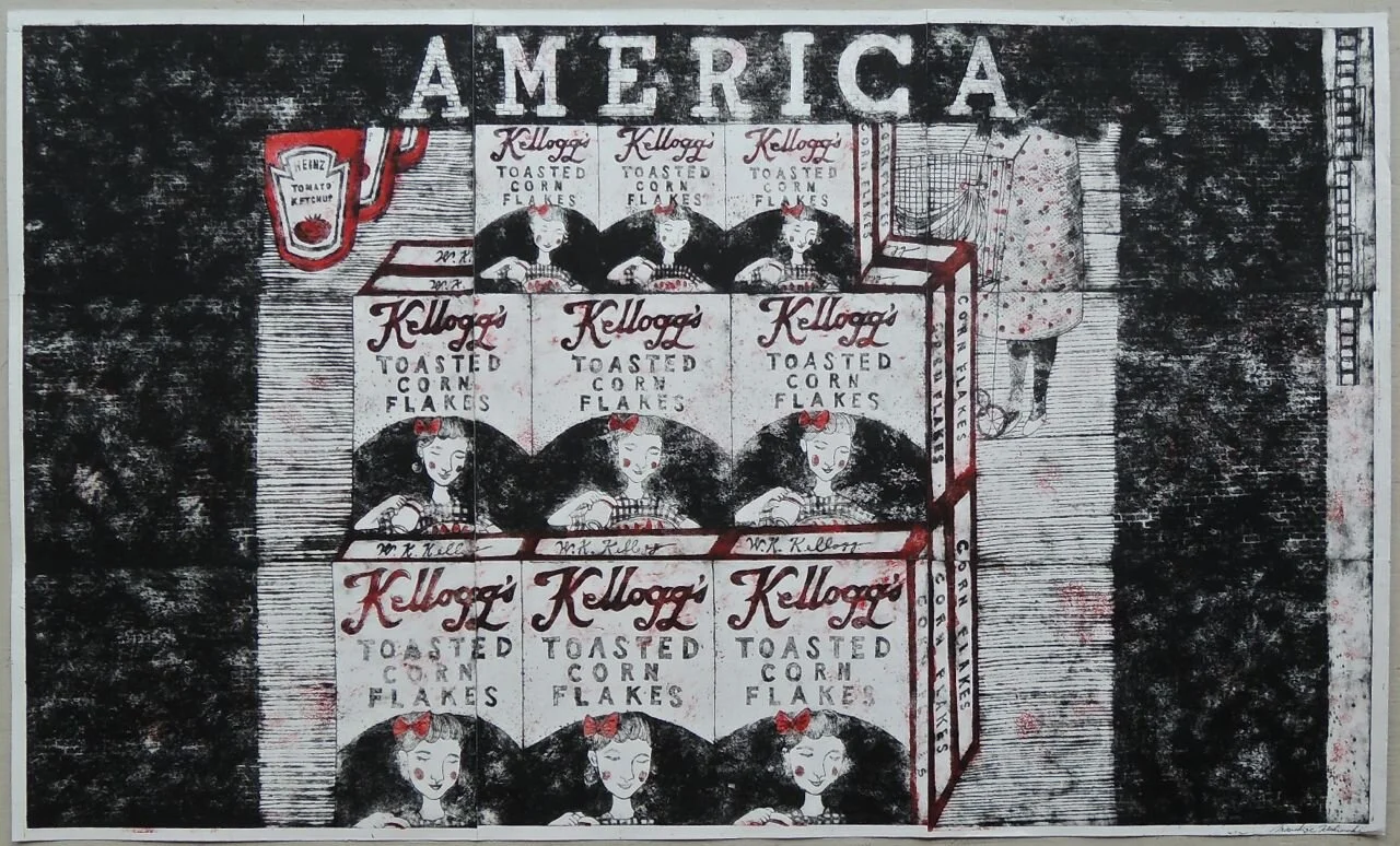 Reminiscent and familiar, yet fanciful and imaginative, Mitsushige Nishiwaki’s metropolitan etchings offer narrative stories that have an “outsider art” point-of-view. He depicts his characters with child-like and cartoonish expression, yet they seem universally commonplace - doing chores of everyday life. Street scenes are naïve and whimsical, often presenting everyday contexts – the bakery, flower shop, and the like. Or, he conjures up urban icons in all sorts of unusual ways. Rooftops turn into outward expressions of the private lives and activities from within. What becomes revealing, is that Nishiwaki seems to make each culture immediately identifiable by the way he personifies everyday life.